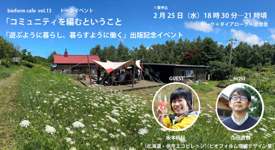 ゲストを迎え、これからのひと・建築・環境・地域についてともに語り合うトークライブ「bioform cafe まちとしぜん」。13回目は、「北海道・余市エコビレッジ」代表の坂本純科さんをお迎えします。