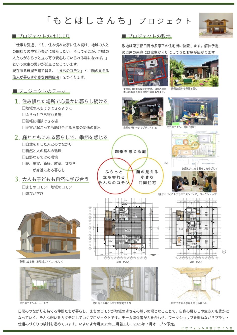 もとはしさんちプロジェクトは、「仕事を引退しても住みれた家に住み続け、地域の人との関わりの中で心豊かに暮らしたい。そしてそこが、地域の人たちがふらっと立ち寄り安心していられる場になれば」というもとはしさんの思いが起点となり、もとはしさんの住まいのお隣に、地域に開く「まちのコモン」「共用庭」「顔の見える住人が暮らす小さな共同住宅」をつくり、庭と共にある暮らしで季節を感じ、大人も子供も自然に学びあえる場を育て、地域の中で心豊かに暮らし続けていこうというものです。