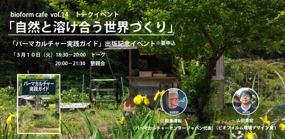 ゲストを迎え、これからのひと・建築・環境・地域についてともに語り合うトークライブ「bioform cafe まちとしぜん」。14回目は、「パーマカルチャーセンタージャパン」の設立者であり、日本におけるパーマカルチャーの草分け「パーマカルチャーセンタージャパン」代表の設楽清和さんをお迎えします。