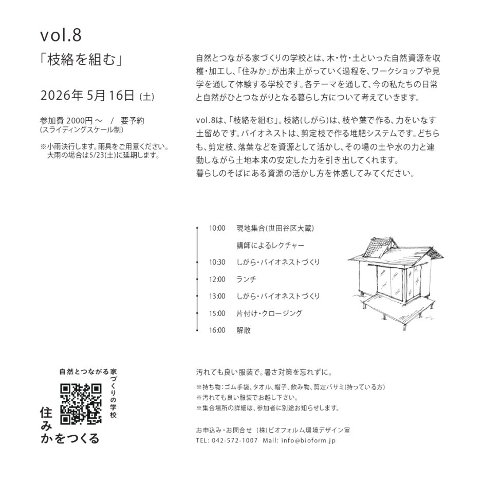 Vol.8は「枝絡を組む」。枝絡(しがら)とバイオネストをつくります。