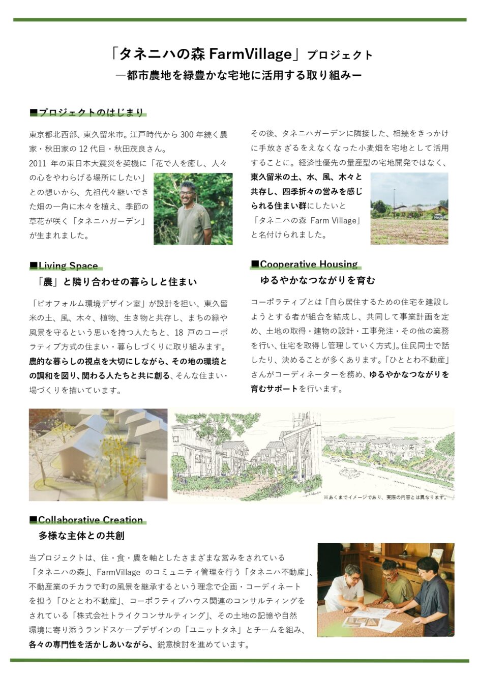 当プロジェクトは、住・食・農を軸としたさまざまな営みをされている「タネニハの森」、さらにFarmVillage のコミュニティ管理を行う「タネニハ不動産」さん、同じく東久留米市学園町に本社を置き不動産業のチカラで町の風景を継承するという理念で企画・コーディネートを担う「ひととわ不動産」さん、コーポラティブハウス関連のコンサルティングをされている「株式会社トライクコンサルティング」さん、その土地の記憶や自然環境に寄り添うランドスケープデザインの「ユニットタネ」さんとチームを組み、各々の専門性を活かしあいながら、鋭意検討を進めています。