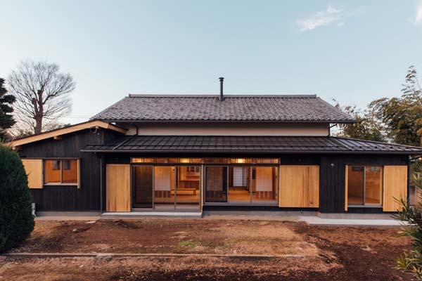 先祖代々続く農家さんの築50年の家の改修。外観は屋根を低く削り、現代的にすっきりとしたフォルムに変更しました。また土壁を残しつつ外側に断熱を施すことで土の蓄熱性を引き出す断熱改修や、屋根面での太陽熱集熱装置「そよ風」の採用、薪ストーブの設置などで温熱環境は格段に向上しました。屋根の瓦はそのまま丁寧におろし、再利用。昔ながらの色むらのあるいぶし瓦は、今や欲しくても作っているところがない貴重な産物です。昔の良き風情を残しながら現代の技術とデザインを付加する、空間と資源の有効活用という意味からも、改修は今後ますます重要になると思います。