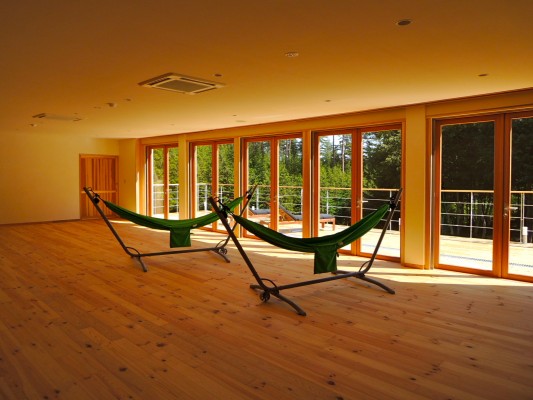 内外装は、できるだけ地産地消の無垢材、自然素材を活用し、健康に配慮するとともに、環境に対するインパクトを最小にすることにしました。特に床材は全面的に地元池田町の赤松を製材したものです。全面的に床暖房を採用し、素材感を体感してもらうべく裸足で歩いていただけるようにしました。キッチンや家具も含めて採用した樹種の名前は全てお部屋の名前となっています。ベッドルームも一部屋ご用意し、車いすの方でもご利用できるようになっています。