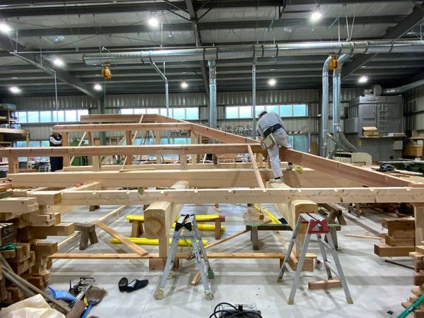 2020年11月2日 伊豆/伊東の家の工事が始まりました。 伊豆/伊東の家の工事が始まりました。二階を減築し、おおらかな平屋に改装します。天井を外したので、小屋内部の梁組が見えます。新築当時の大工さんがどう考えて作ったかを追想するのは楽しいものです。梁組を取り替え、柱をぬいて居間を大きくします。工務店の下小屋では仮組をしていました。