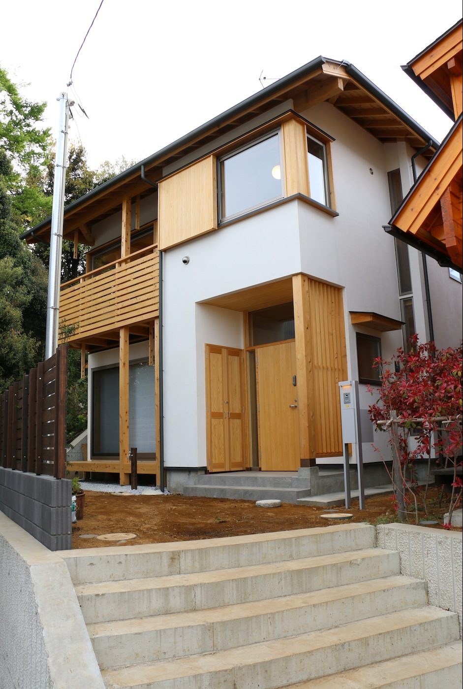 神奈川県藤野町。里山の風景になじみ集落感のある風景を醸す、7件が連なる住宅プロジェクト。プロポーションを低く保ち、勾配屋根を揃え、外装も杉板か漆喰に統一。全体の風情をそろえることで、家が風景の一部になる良質な居住環境づくりを目指しました。