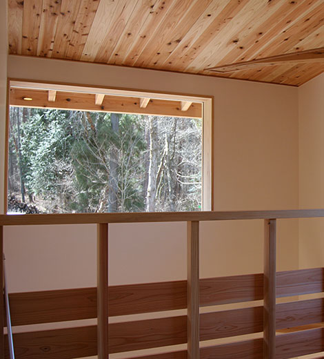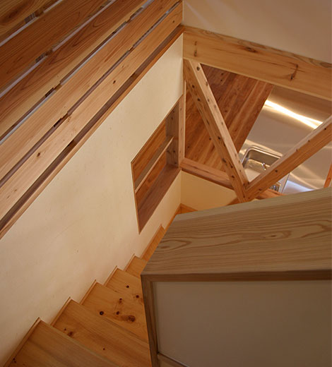 環境の時代を見据え、環境建築としての住宅を意図しました。寒さ対策として南面は全面ガラス、日差しを蓄熱する壁を設置。ペチカには地域材を使用。夏の遮光、遮熱のため「外付けブラインド」を採用、通風のため天窓や妻面上部からの排気を可能にしました。