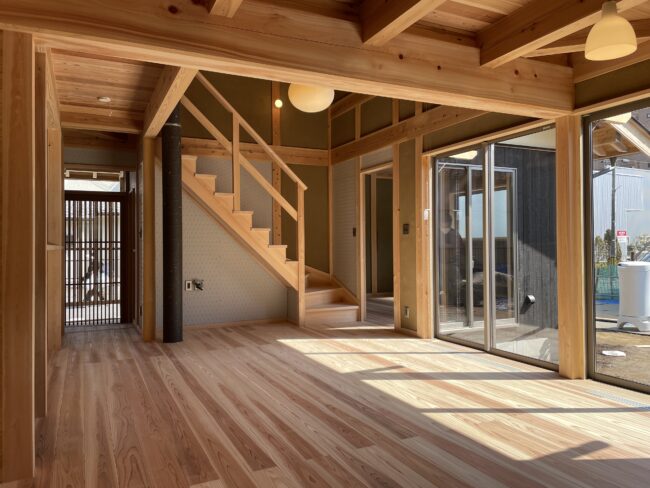 伝統構法で作った平屋建て。住まい手と多摩の山や製材所まで赴き、杉、桧を構造材、内外装材に使用。田の字型の間取りで、無駄な空間がない合理的な配置計画です。土壁の蓄熱性を確保するため外壁側に断熱を施し、内外装は土と木で調湿性も期待できます。