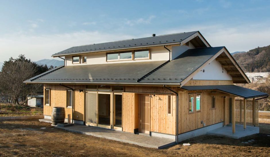 先祖代々続く農家さんの築50年の家の改修。耐震補強を施し、外観は屋根を低く削り現代的なフォルムにしました。土壁の外側に断熱を施し蓄熱性を引き出す断熱改修や、太陽熱集熱装置「そよ風」の採用、薪ストーブの設置で温熱環境の向上を実現しています。