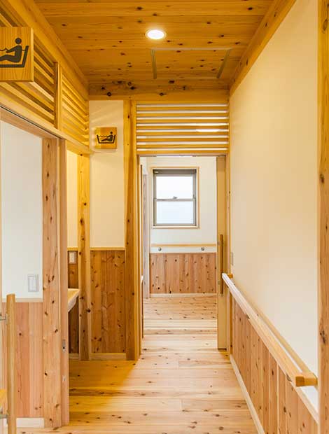 地の杉、桧でつくられた空間はそうしたプログラムを下支えする安心感のあるものとなっています。