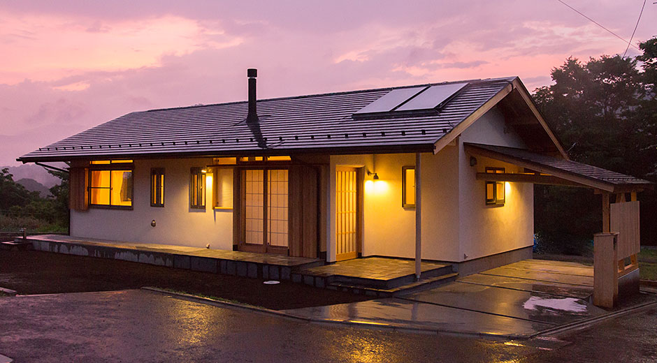農的暮らしができる場として菜園や土間を設け、台所や食品庫との回遊に配慮した設計としています。土間は太陽熱の蓄熱にも一役かい、またそよ風システムや薪ストーブの採用で、化石燃料にたよらず、かつ地元の山の資源を活用するエネルギーの地産地消も目指しています。